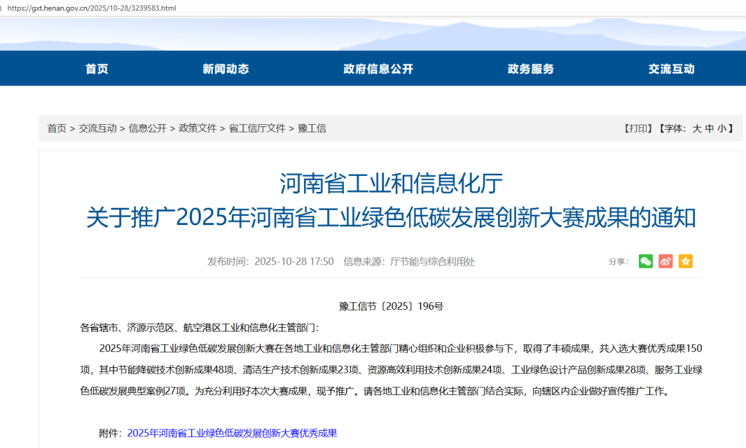 10月28日,河南省工业和信息化厅正式发布《关于推广2025年河南省工业绿色低碳发展创新大赛成果的通知》。中标合信(北京)认证有限公司(以下简称“中标合信”)全流程辅导的“漯河大旺食品有限公司绿色工厂创建”项目,从150项优秀成果中脱颖而出,成为27个“服务工业绿色低碳发展创新大赛典型案例”之一!