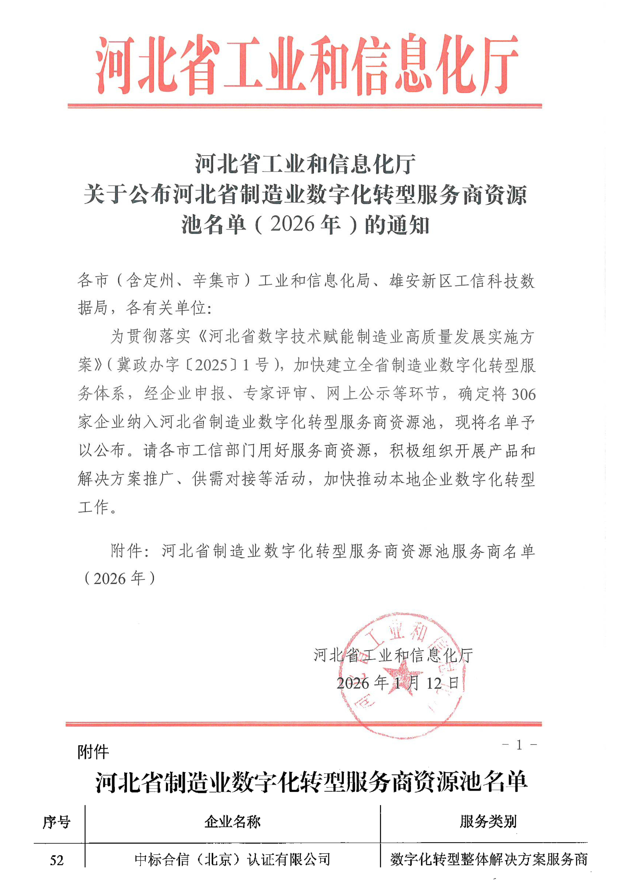 近日,河北省工信和信息化厅公布制造业数字化转型服务商资源池名单,中标合信(北京)认证有限公司(简称“中标合信”)凭借深厚的技术积淀、成熟的解决方案与丰富的产业实践,成功入选,标志着公司在数字化转型服务领域的专业能力获得省级权威认可。
