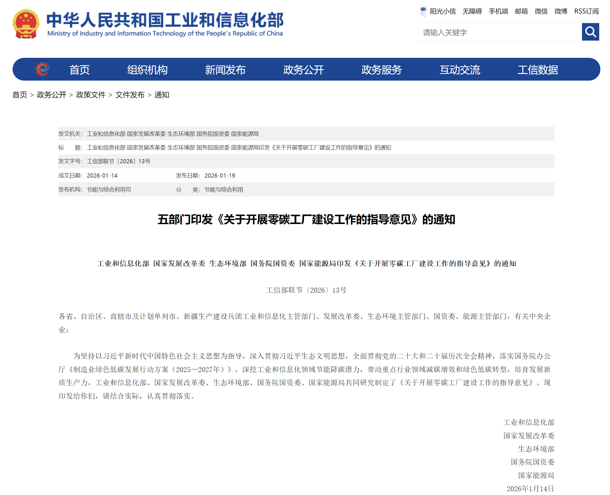 近日,工业和信息化部、国家发展改革委、生态环境部、国务院国资委、国家能源局等五部门联合印发《关于开展零碳工厂建设工作的指导意见》(工信部联节〔2026〕13号,以下简称《指导意见》),深挖工业和信息化领域节能降碳潜力,带动重点行业领域减碳增效和绿色低碳转型,培育发展新质生产力。